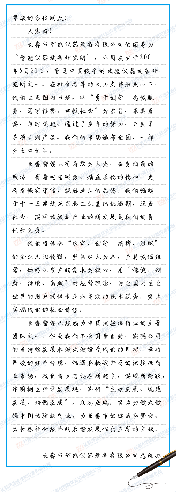 長春市智能儀器設備有限公司于2001年5月3日注冊成立,注冊資本500萬元,是由吉林大學等四所大學,中科院應用化學研究所,國家電化學測試中心等三個研究所,四個儀器制造廠組建的實體機構,是集自主研發(fā)、生產、售后服務等全過程于一身的科技型民營企業(yè),是國內較早開發(fā)、生產試驗機的企業(yè)。我們專門從事光機電一體化的試驗儀器、分析儀以及汽車零部件的檢測儀器的研發(fā)、制造。