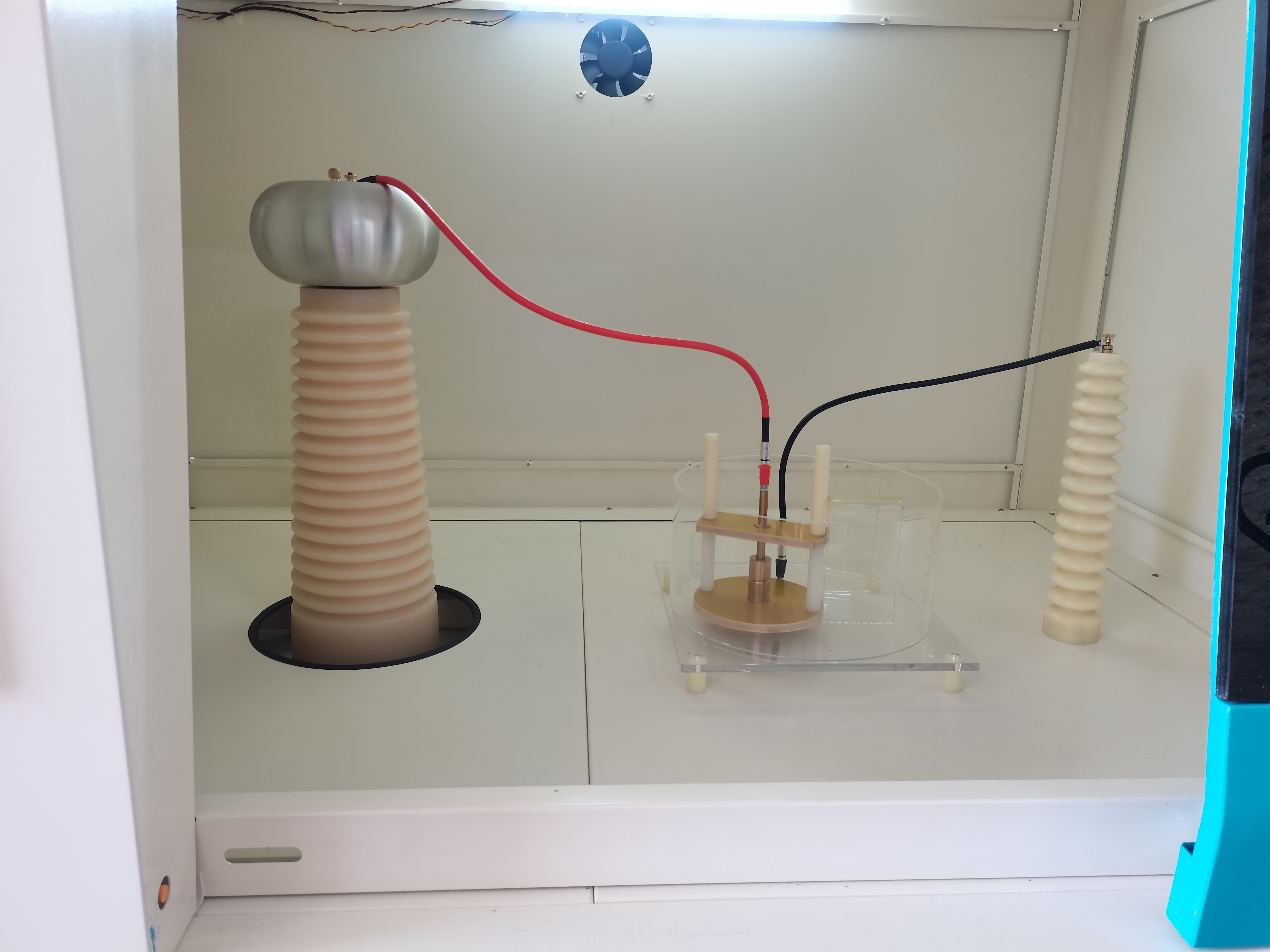 本設(shè)備主要由:升壓系統(tǒng)(高壓變壓器)、測量系統(tǒng)、A/D轉(zhuǎn)換器、放電系統(tǒng)、電極、油箱、電極定位架、計(jì)算機(jī)數(shù)據(jù)處理系統(tǒng)、軟件等組成
