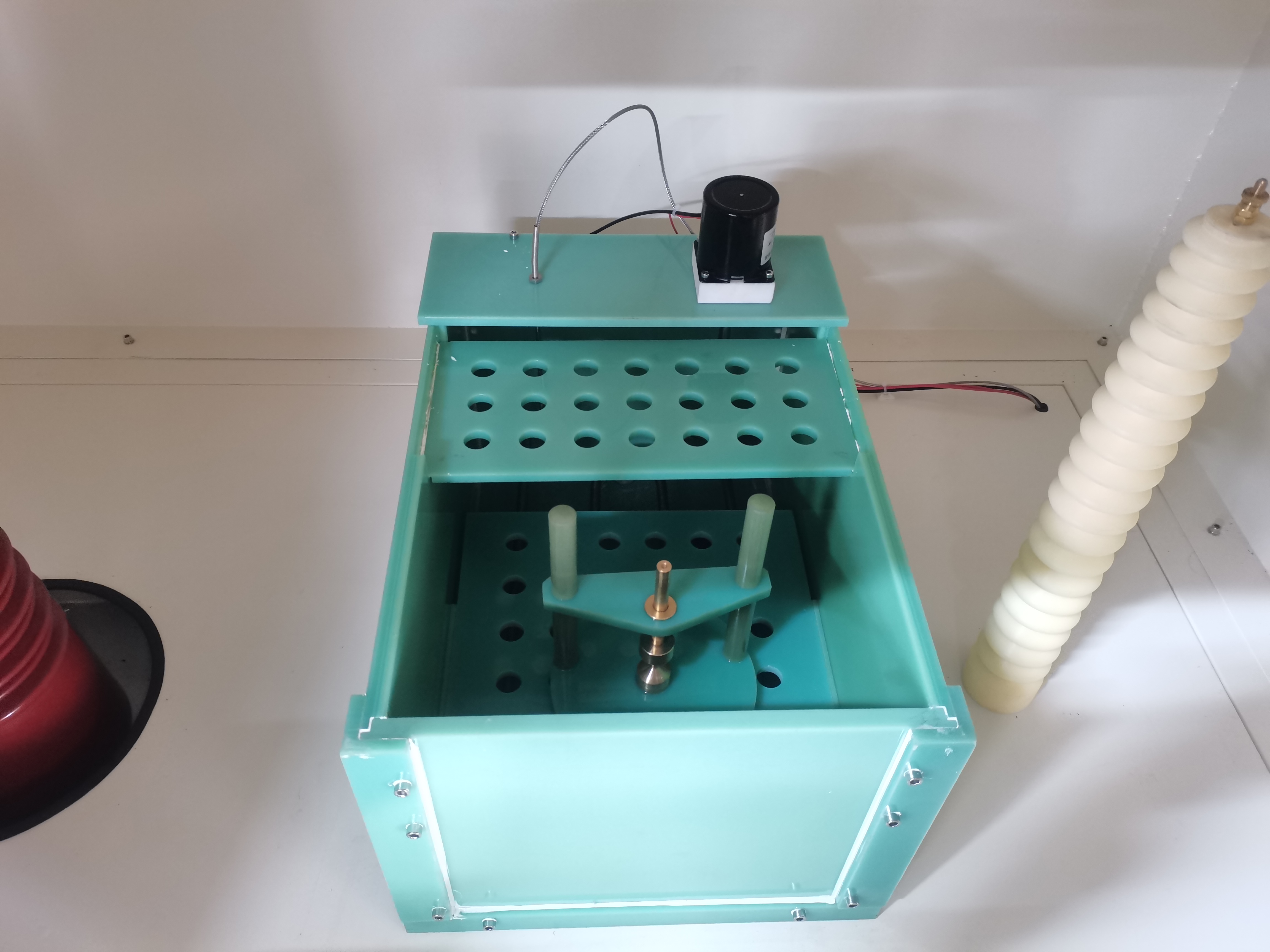 設備配有三色報警燈,綠燈亮時表示箱門關(guān)閉良好可以開始試驗,黃燈亮時表示試驗箱門打開,此時可進行試樣更換。紅燈亮時表示高壓大于0.5KV,此時不要開箱門。直流試驗結(jié)束放電過程警報燈會閃爍且報警。(總結(jié):綠燈箱門關(guān)閉良好,黃燈開門小心操作,紅燈有高壓)